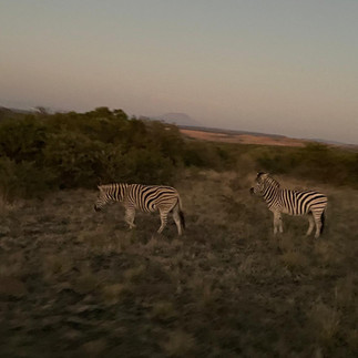 Nambiti Reserve is a 23,000 acre private reserve with a variety of animals, including Africa’s Big 5: lions, elephants, buffalo, rhinos, and leopards. We first saw a large group of wildebeest. There were ostriches, zebras, and warthogs in the distance. Shortly after, we saw a lone Cape buffalo near the edge of the road. It was so cool, but also very intimidating to see it at such a close distance. We then came across two rhinos, a mother and a baby, between a pond and the road. Matthew told us how rare it is to see rhinos so close, so we were especially ecstatic. Our tour guide shared with us knowledge about the rhinos on the reserve, and how they track and dehorn them to prevent poaching from occurring. Next, we saw several giraffes. We learned that a group of giraffes is called a journey when they are moving together, while it is called a tower when they are just standing still. We drove towards a ridge where we briefly saw two female lions lying down in the grass and eating. We ventured on and came across a family of several hippos, including a baby, swimming near the edge of the pond. This was a surprise as we had just been having a conversation about how there are not often hippos on this specific part of the reserve. After seeing the hippos, we drove towards the top of the ridge and made a stop for a light snack and drinks. Prior to starting the drive, our drink orders were taken and snacks including, potato samosas, game meat jerky, and peanuts were served. We set off for the lodge to conclude our game drive for the evening, and came across two zebras followed shortly after by two cheetahs walking down the path.